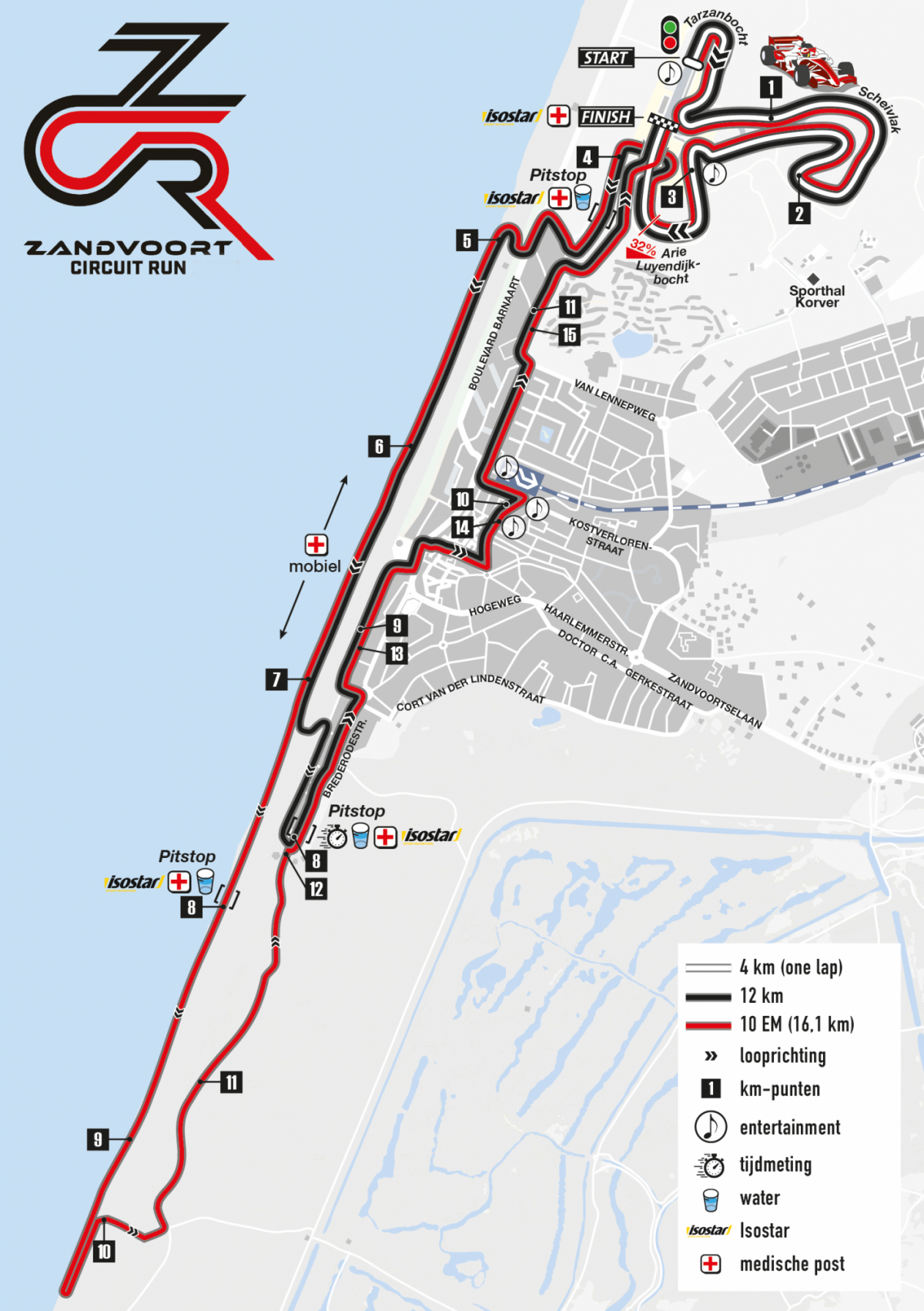 After the start from the Pitstraat at Circuit Zandvoort and passing the Tarzanbocht, a whole lap of 4 km will be made at the legendary racing circuit. After, the participants run towards the Boulevard and heading south over the beach. After 3 km of beach, the Zuid-Boulevard is reached, where the participants run back to the circuit through the atmospheric center of Zandvoort. The finish is in front of the grandstand on the circuit.